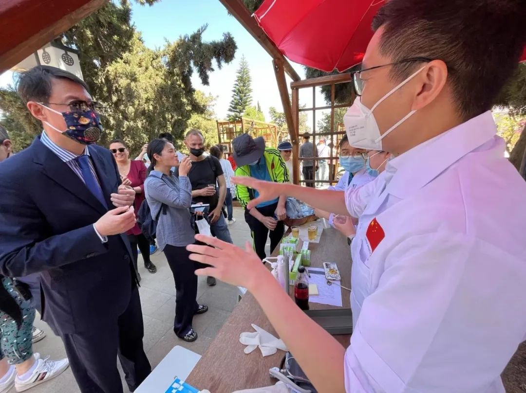 在义诊过程中,中国驻马耳他大使馆于敦海大使亲临现场与医疗队员们亲切交谈。他说:今年是中马建交50周年,从1994年起,中国已先后向马耳他派出了17批医疗队,累计为超过30万人次的马耳他人民提供过中医特色诊疗服务,小小的银针,见证了中马两国之间的深厚友谊。于大使勉励大家要继续努力,发挥自身所长,以中医技术为抓手,以为马耳他民众提供优质高效的医疗服务为纽带,更好的传播中医和中国文化,为进一步提高国家的软实力做出自己的贡献。