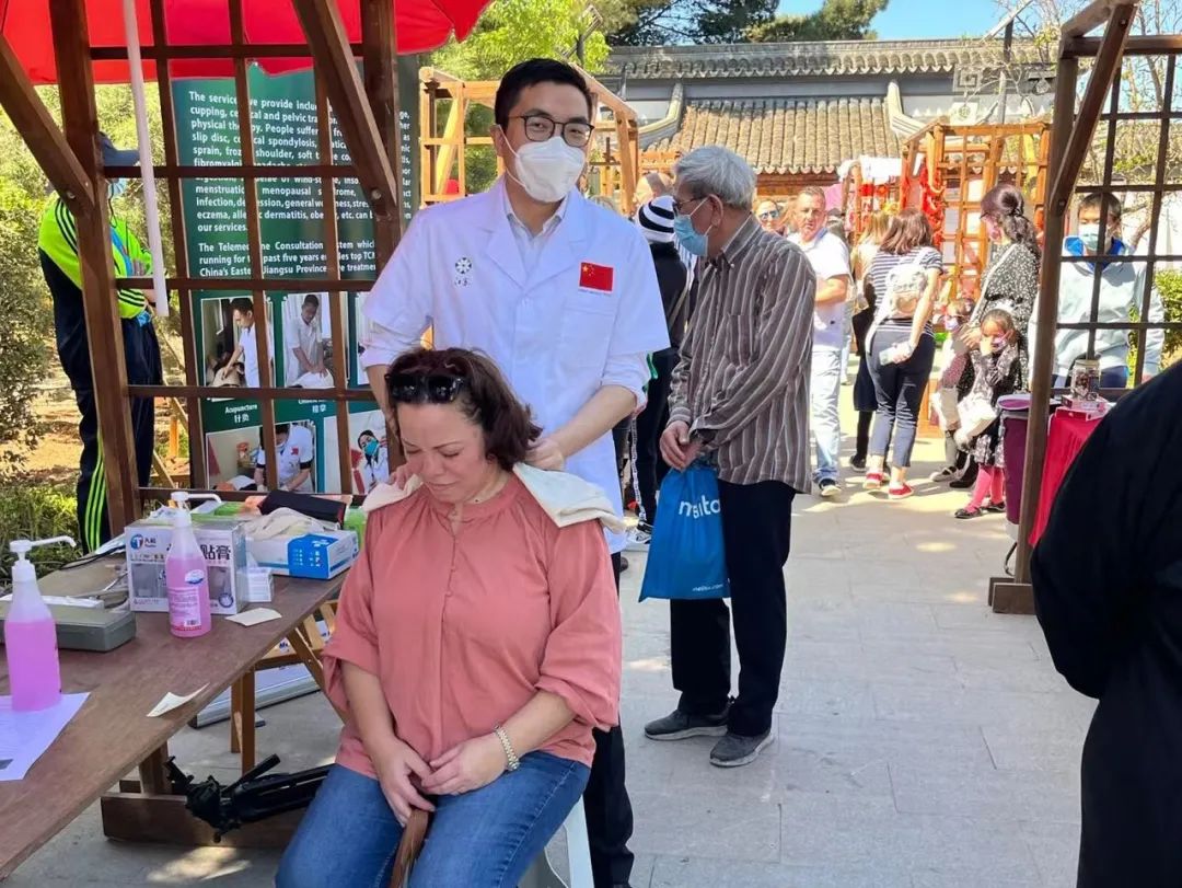 2022年4月24日,中国(江苏)第17期援马耳他医疗队受邀参加中国与马耳他建交50周年纪念雕塑揭幕仪式暨春季庙会活动,该活动在马耳他最大的中国式园林-静园举办。医疗队利用此次线下机会组织了来马以后的首次中医义诊及宣传推广活动,通过当地民众跟中国医生面对面的接触,让更多马耳他人知道了马耳他地中海地区中医中心,知道了中国医疗队的故事。